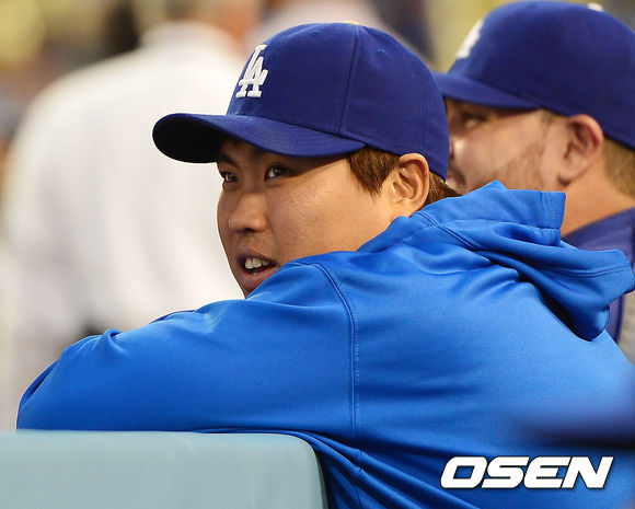 13일 (이하 한국시간) 미국 캘리포니아주 로스앤젤레스 다저스타디움에서 열린 2013 메이저리그 LA 다저스와 샌프란시스코 자이언츠의 경기, 다저스 류현진이 덕아웃에서 그라운드를 바라보고 있다.