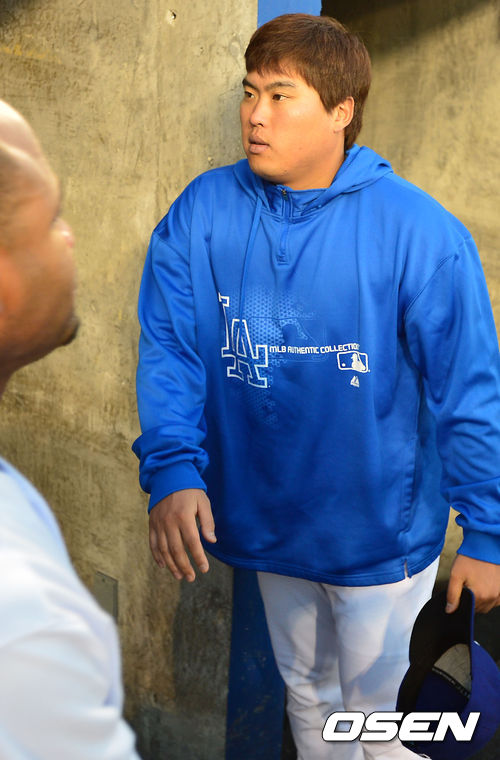 13일 (이하 한국시간) 미국 캘리포니아주 로스앤젤레스 다저스타디움에서 열린 2013 메이저리그 LA 다저스와 샌프란시스코 자이언츠의 경기, 다저스 류현진이 덕아웃으로 걸어나오고 있다.
