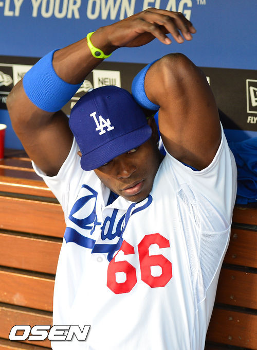 13일 (이하 한국시간) 미국 캘리포니아주 로스앤젤레스 다저스타디움에서 열린 2013 메이저리그 LA 다저스와 샌프란시스코 자이언츠의 경기, 다저스 푸이그가 덕아웃에서 몸을 풀고 있다.