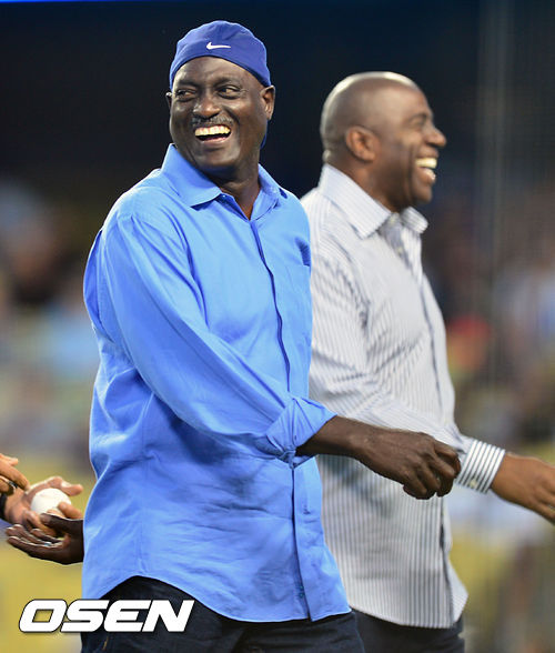 13일 (이하 한국시간) 미국 캘리포니아주 로스앤젤레스 다저스타디움에서 열린 2013 메이저리그 LA 다저스와 샌프란시스코 자이언츠의 경기, 매직 존슨과 함께 LA 레이커스에서 활약했던 마이클 쿠퍼가 시구를 마치고 매직 존슨과 환하게 미소짓고 있다.
