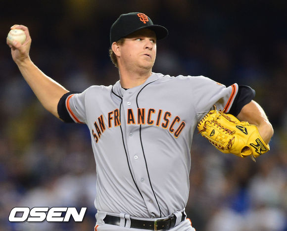 13일 (이하 한국시간) 미국 캘리포니아주 로스앤젤레스 다저스타디움에서 열린 2013 메이저리그 LA 다저스와 샌프란시스코 자이언츠의 경기, 샌프란시스코 선발 맷 케인이 힘차게 공을 뿌리고 있다.