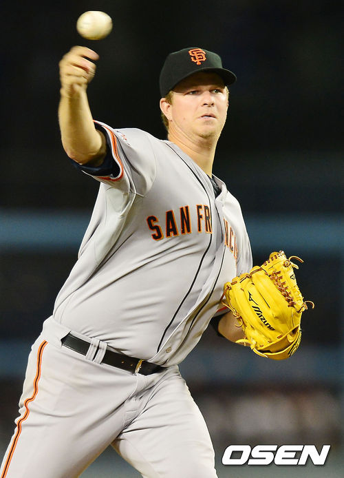 13일 (이하 한국시간) 미국 캘리포니아주 로스앤젤레스 다저스타디움에서 열린 2013 메이저리그 LA 다저스와 샌프란시스코 자이언츠의 경기, 샌프란시스코 자이언츠 선발 맷 케인이 힘차게 공을 뿌리고 있다.