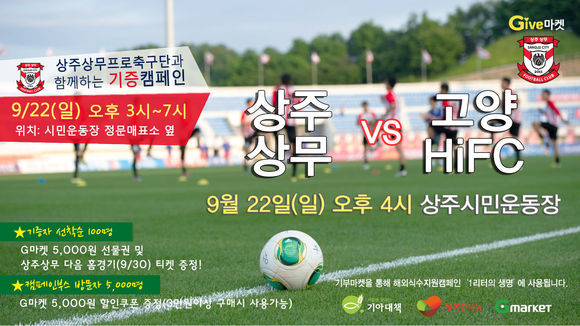 한편, 상주는 16일 오후 8시 현대오일뱅크 K리그 챌린지 2013 24라운드 부천FC와 원정 경기를 앞두고 있으며, 캠페인 당일인 22일 오후 4시 상주시민운동장에서 고양 Hi FC와 경기를 치른다. Give마켓은 경기 당일 정문 매표소 옆에서 오후 1시부터 오후 5시까지 진행된다.