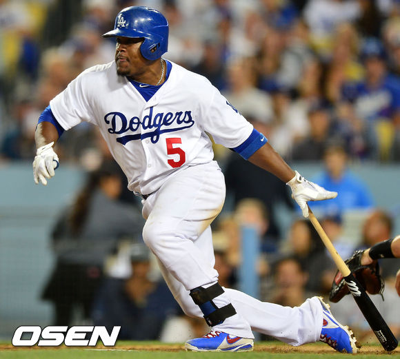 13일 (이하 한국시간) 미국 캘리포니아주 로스앤젤레스 다저스타디움에서 열린 2013 메이저리그 LA 다저스와 샌프란시스코 자이언츠의 경기, 4회말 선두타자 다저스 유리베가 좌전 안타를 날리고 있다.