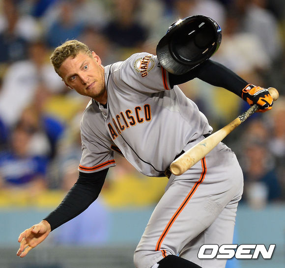 13일 (이하 한국시간) 미국 캘리포니아주 로스앤젤레스 다저스타디움에서 열린 2013 메이저리그 LA 다저스와 샌프란시스코 자이언츠의 경기, 6회초 1사 주자 없는 상황에서 샌프란시스코 펜스가 유격수 땅볼 을 날린 후 달려나갈때 헬멧이 벗겨지고 있다.