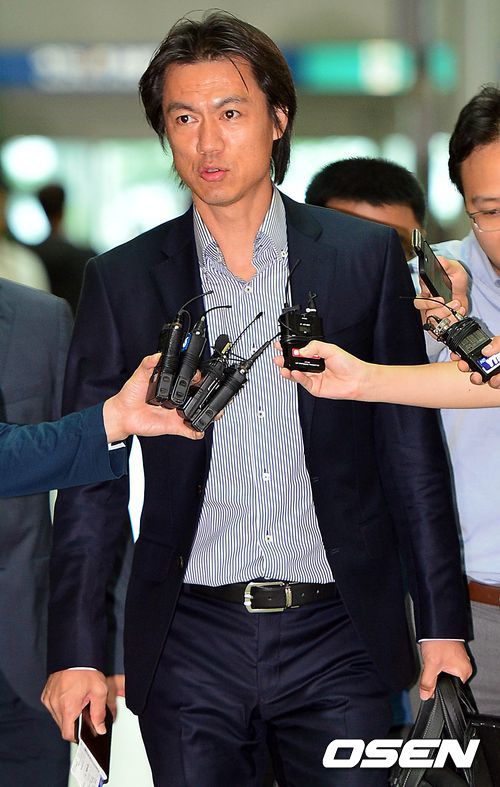 홍명보 감독이 취재진의 질문을 받으며 출국장으로 향하고 있다.
