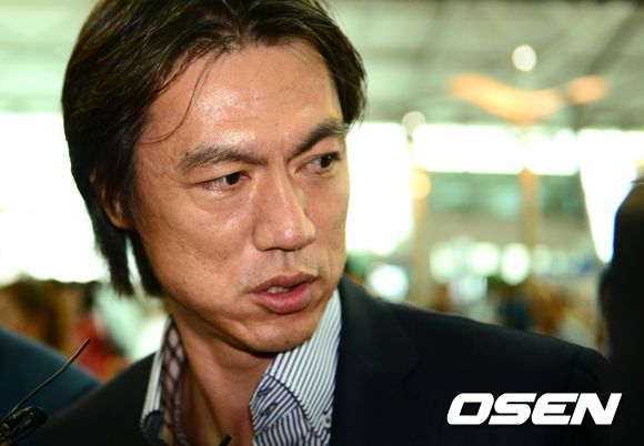 홍명보 감독이 취재진의 질문을 받으며 출국장으로 향하고 있다.