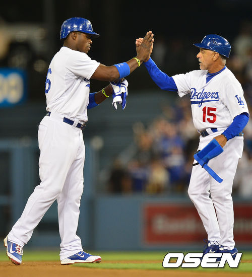 13일 (이하 한국시간) 미국 캘리포니아주 로스앤젤레스 다저스타디움에서 열린 2013 메이저리그 LA 다저스와 샌프란시스코 자이언츠의 경기, 7회말 2사 주자 3루 다저스 푸이그가 역전 1타점 적시타를 날린 후 2루에서 기뻐하고 있다.