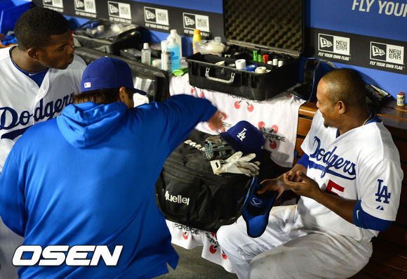 13일 (이하 한국시간) 미국 캘리포니아주 로스앤젤레스 다저스타디움에서 열린 2013 메이저리그 LA 다저스와 샌프란시스코 자이언츠의 경기, 8회초 1사 주자 만루 벨트의 3루수 병살타때 병살로 연결시킨 다저스 3루수 유리베에게 류현진이 다가가 장난을 치고 있다.