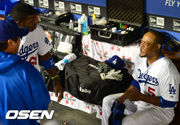 13일 (이하 한국시간) 미국 캘리포니아주 로스앤젤레스 다저스타디움에서 열린 2013 메이저리그 LA 다저스와 샌프란시스코 자이언츠의 경기, 8회초 1사 주자 만루 벨트의 3루수 병살타때 병살로 연결시킨 다저스 3루수 유리베에게 덕아웃에서 류현진이 다가가 장난을 치자 환하게 웃고 있다.