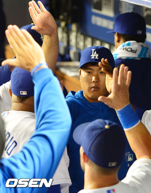 13일 (이하 한국시간) 미국 캘리포니아주 로스앤젤레스 다저스타디움에서 열린 2013 메이저리그 LA 다저스와 샌프란시스코 자이언츠의 경기, 8회초 1사 주자 만루 마운드에 오른 벨리사리오가 3루수 병살타로 이닝을 마친 후 덕아웃에서 류현진과 하이파이브를 하고 있다.