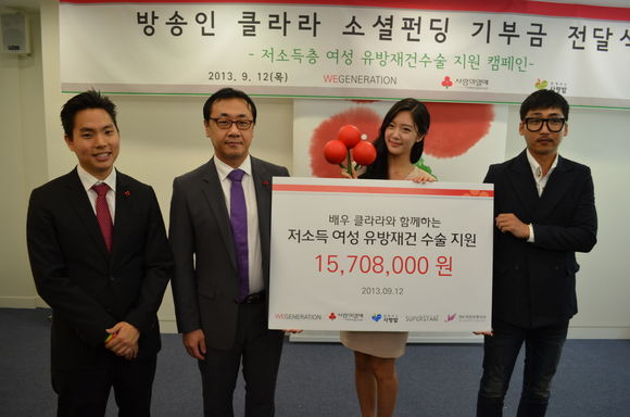 클라라는 지난 12일 개인 성금과 함께 소셜펀딩 위제너레이션을 통해 모금된 저소득 여성 유방재건수술 지원 성금 1천 570만 원을 사랑의 열매 측에 전달했다.