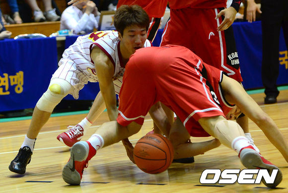 13일 오후 경기도 수원대학교 체육관에서 열린 2013KB국민은행 대학농구리그 경희대와 고려대의 2차전, 1쿼터 경희대 김민구와 고려대 이승현이 루즈볼 다툼을 벌이고 있다.