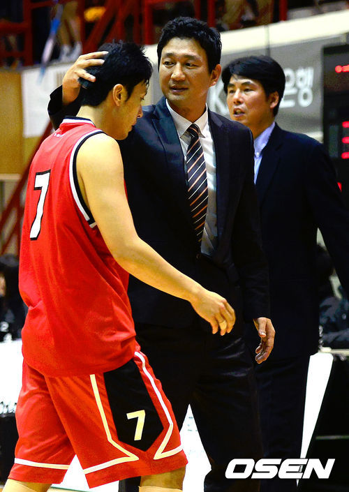 13일 오후 경기도 수원대학교 체육관에서 열린 2013KB국민은행 대학농구리그 경희대와 고려대의 2차전, 3쿼터 고려대 이민형 감독이 경희대 작전 타임때 벤치로 들어오는 문성곤을 격려하고 있다.