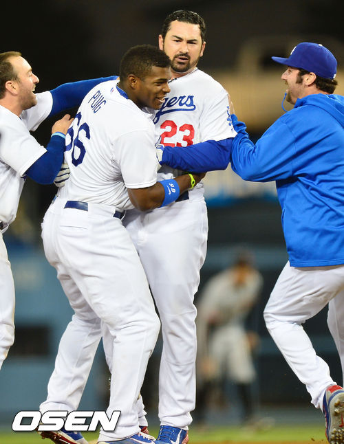 10회말 1사 주자 2루 다저스 곤살레스가 끝내기 안타를 날린 후 동료들과 기쁨을 나누고 있다. / rumi@osen.co.kr