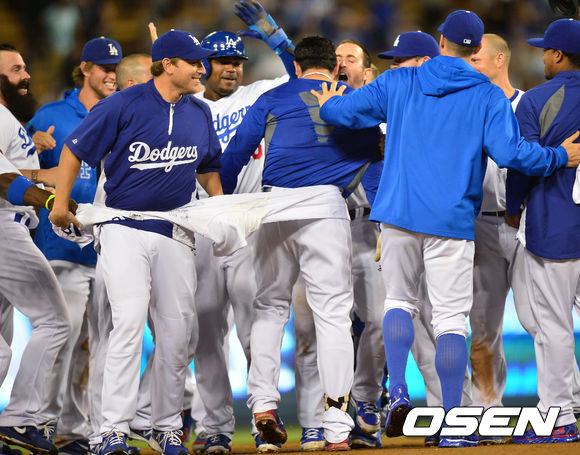 10회말 1사 주자 2루 다저스 곤살레스가 끝내기 안타를 날린 후 동료들에게 유니폼을 찢기고 있다. / rumi@osen.co.kr