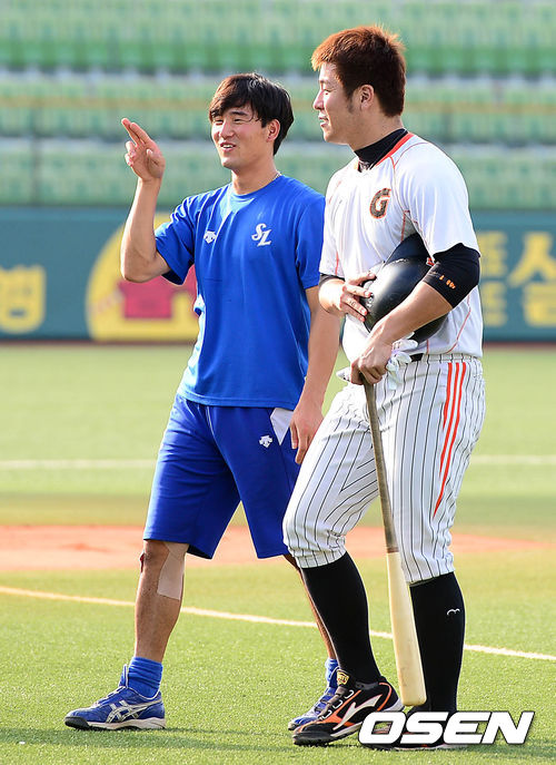 13일 오후 대구시민운동장 야구장에서 열린 2013 한국야쿠르트 세븐프로야구 삼성 라이온즈와 롯데 자이언츠의 경기, 경기에 앞서 삼성 김상수와 롯데 강민호가 이야기를 나누고 있다.