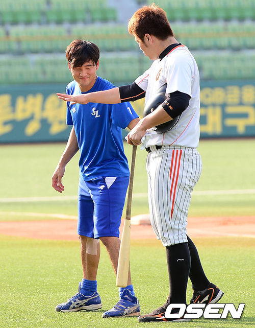 13일 오후 대구시민운동장 야구장에서 열린 2013 한국야쿠르트 세븐프로야구 삼성 라이온즈와 롯데 자이언츠의 경기, 경기에 앞서 삼성 김상수와 롯데 강민호가 이야기를 나누고 있다.