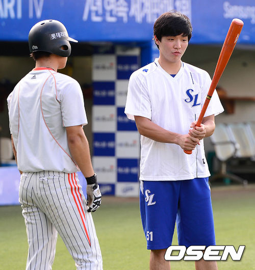 13일 오후 대구시민운동장 야구장에서 열린 2013 한국야쿠르트 세븐프로야구 삼성 라이온즈와 롯데 자이언츠의 경기, 경기에 앞서 삼성 정형식이 롯데 조홍석과 이야기를 나누고 있다.