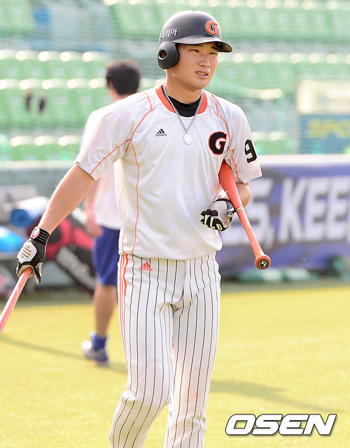 13일 오후 대구시민운동장 야구장에서 열린 2013 한국야쿠르트 세븐프로야구 삼성 라이온즈와 롯데 자이언츠의 경기, 경기에 앞서 롯데 조홍석이 타격 훈련을 하기 위해 그라운드로 나가고 있다.