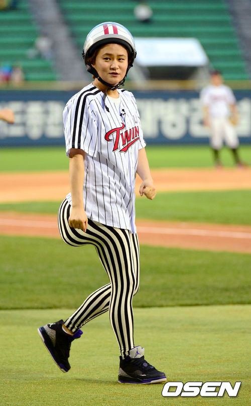 13일 오후 서울 잠실야구장에서 열린 '2013 한국야쿠르트 세븐 프로야구' LG 트윈스와 KIA 타이거즈의 경기전 김신영이 시타를 위해 그라운드로 들어서고 있다.