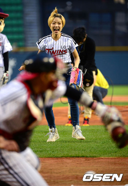 13일 오후 서울 잠실야구장에서 열린 '2013 한국야쿠르트 세븐 프로야구' LG 트윈스와 KIA 타이거즈의 경기전 안영미가 시구를 한 뒤 아쉬운 표정을 짓고 있다.