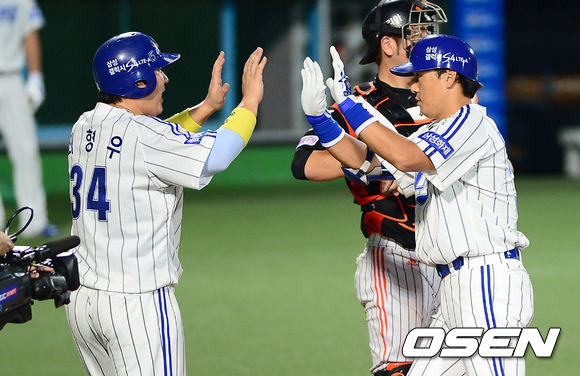 13일 오후 대구시민운동장 야구장에서 열린 2013 한국야쿠르트 세븐프로야구 삼성 라이온즈와 롯데 자이언츠의 경기, 1회말 1사 1,2루에서 삼성 이승엽이 우월 스리런 홈런을 치고 홈에서 최형우와 하이파이브를 하고 있다.