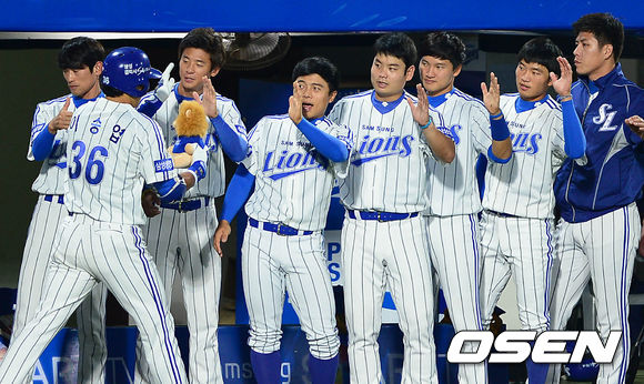 13일 오후 대구시민운동장 야구장에서 열린 2013 한국야쿠르트 세븐프로야구 삼성 라이온즈와 롯데 자이언츠의 경기, 1회말 1사 1,2루에서 삼성 이승엽이 우월 스리런 홈런을 치고 덕아웃에서 동료들의 축하를 받고 있다.