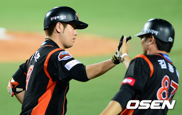 13일 오후 대구시민운동장 야구장에서 열린 2013 한국야쿠르트 세븐프로야구 삼성 라이온즈와 롯데 자이언츠의 경기, 2회초 2사 2루에서 롯데 강민호가 좌월 투런 홈런을 치고 1루에서 김응국 코치와 하이파이브를 하고 있다.