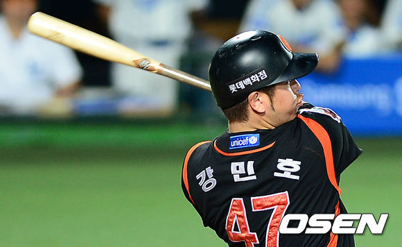 13일 오후 대구시민운동장 야구장에서 열린 2013 한국야쿠르트 세븐프로야구 삼성 라이온즈와 롯데 자이언츠의 경기, 2회초 2사 2루에서 롯데 강민호가 좌월 투런 홈런을 치고 있다.