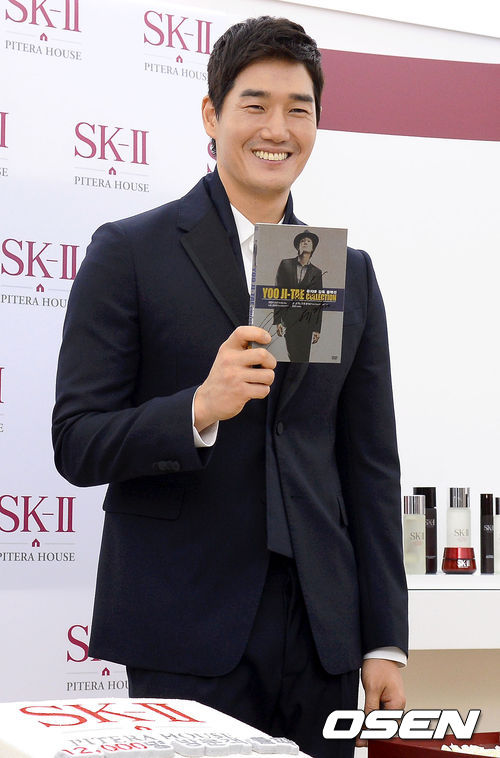 13일 오후 서울 종로구 팔판동 SK-II 팝업 스토어에서 열린 'SK-II 피테라 하우스 12,000명 돌파 기념' 이벤트에 참석한 유지태 사인DVD를 들고 포토타임을 갖고 있다.