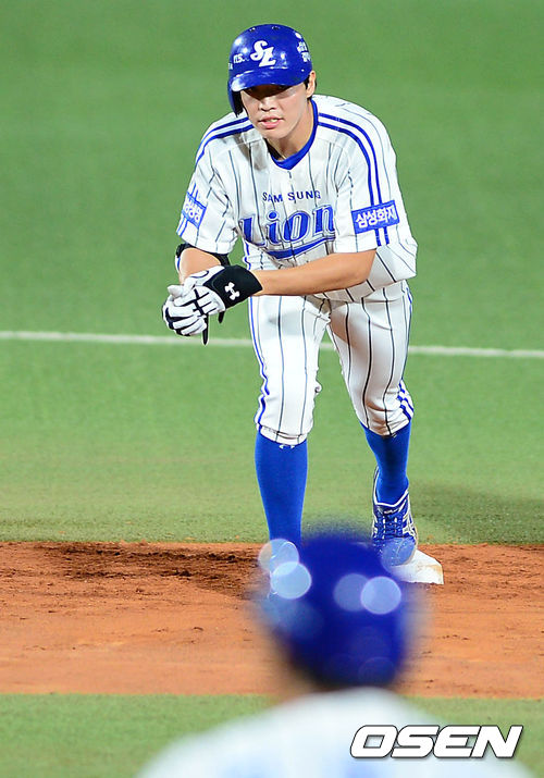 13일 오후 대구시민운동장 야구장에서 열린 2013 한국야쿠르트 세븐프로야구 삼성 라이온즈와 롯데 자이언츠의 경기, 2회말 1사 1,3루에서 삼성 정혁식이 좌중간을 가르는 2타점 적시 2루타를 치고 타임을 외치고 있다.