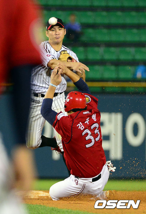 13일 오후 서울 잠실야구장에서 열린 '2013 한국야쿠르트 세븐 프로야구' LG 트윈스와 KIA 타이거즈의 경기, 4회초 1사 만루 LG 오지환이 최훈락의 내야 땅볼때 1루주자 김주형을 포스아웃으로 잡아낸 뒤 1루로 송구하고 있다. 결과는 세이프.