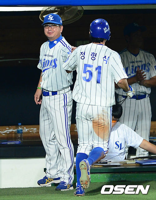 13일 오후 대구시민운동장 야구장에서 열린 2013 한국야쿠르트 세븐프로야구 삼성 라이온즈와 롯데 자이언츠의 경기, 2회말 1사 2루에서 삼성 박한이의 우중간을 가르는 적시타 때 홈을 밟은 2루주자 정형식이 류중일 감독의 축하를 받고 있다.