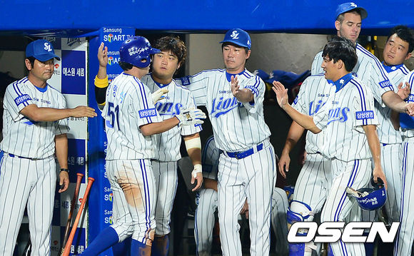 13일 오후 대구시민운동장 야구장에서 열린 2013 한국야쿠르트 세븐프로야구 삼성 라이온즈와 롯데 자이언츠의 경기, 2회말 1사 2루에서 삼성 박한이의 우중간을 가르는 적시타 때 홈을 밟은 2루주자 정형식이 덕아웃에서 동료들의 축하를 받고 있다.