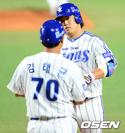13일 오후 대구시민운동장 야구장에서 열린 2013 한국야쿠르트 세븐프로야구 삼성 라이온즈와 롯데 자이언츠의 경기, 2회말 2사 2,3루에서 삼성 박석민이 중전 2타점 적시타를 치고 김태균 코치와 하이파이브를 하고 있다.