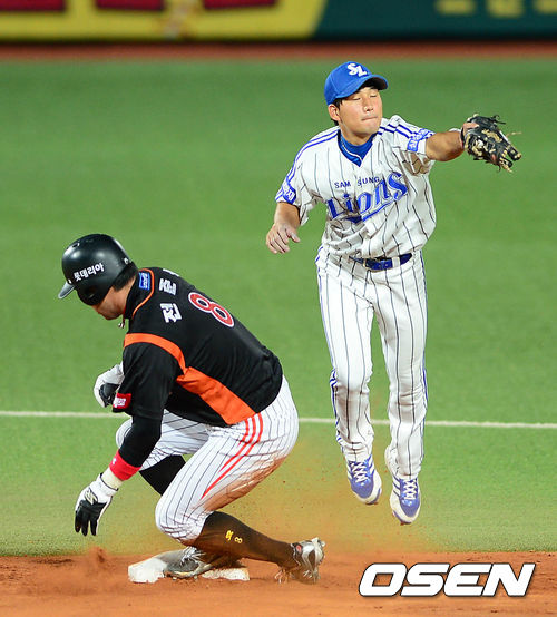13일 오후 대구시민운동장 야구장에서 열린 2013 한국야쿠르트 세븐프로야구 삼성 라이온즈와 롯데 자이언츠의 경기, 2회초 1사 1루에서 롯데 황재균의 희생플라이 때 태그업을 시도한 1루주자 전준우가 세이프 되고 있다.
