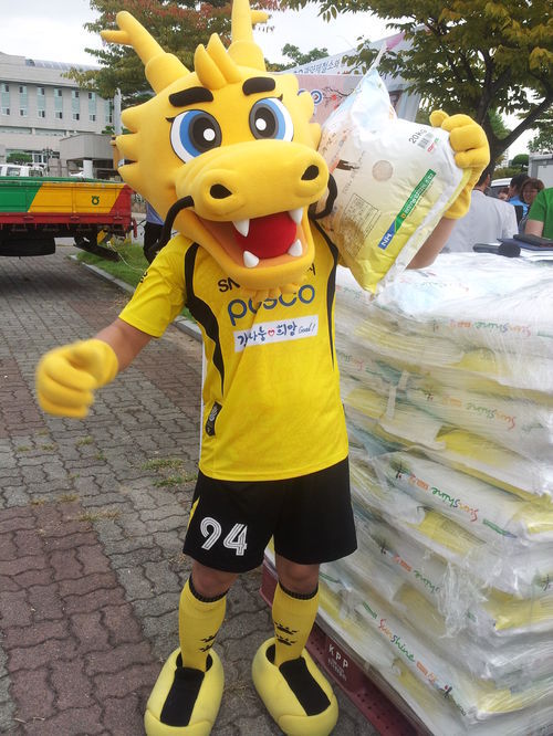 전남 드래곤즈 마스코트 ‘철룡이’가 도민들을 위해 봉사하고 있다.