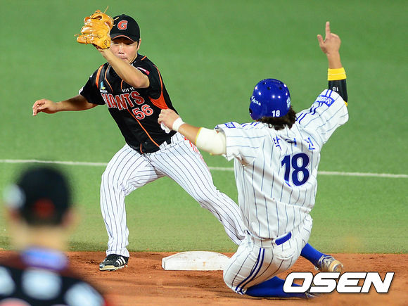 13일 오후 대구시민운동장 야구장에서 열린 2013 한국야쿠르트 세븐프로야구 삼성 라이온즈와 롯데 자이언츠의 경기, 1회말 2사 1루에서 삼성 우동균 타석 때 1루주자 박석민이 도루를 시도하고 있다.