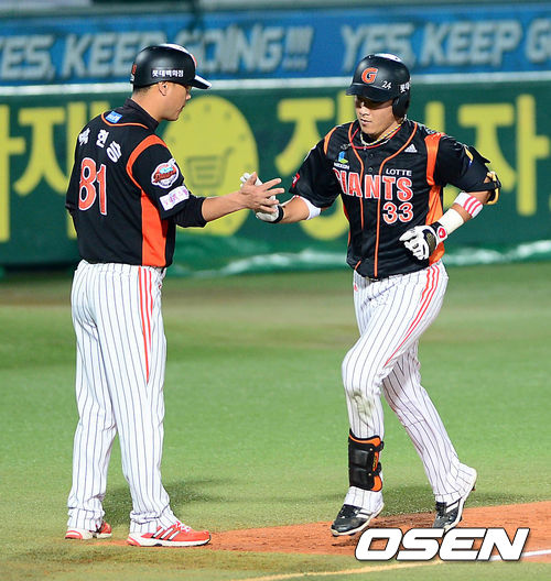 13일 오후 대구시민운동장 야구장에서 열린 2013 한국야쿠르트 세븐프로야구 삼성 라이온즈와 롯데 자이언츠의 경기, 5회초 2사에서 롯데 정훈이 좌월 솔로 홈런을 치고 3루에서 박현승 코치와 하이파이브를 하고 있다.