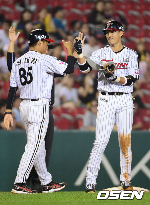 13일 오후 서울 잠실야구장에서 열린 '2013 한국야쿠르트 세븐 프로야구' LG 트윈스와 KIA 타이거즈의 경기, 5회말 무사 1루 LG 박용택이 동점 3루타를 때린 뒤 3루 최태원 코치와 기뻐하고 있다.