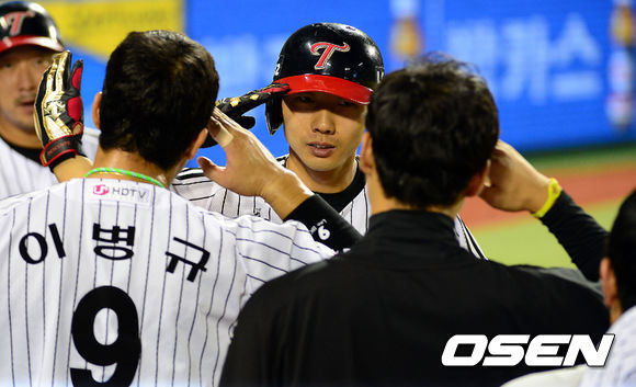 13일 오후 서울 잠실야구장에서 열린 '2013 한국야쿠르트 세븐 프로야구' LG 트윈스와 KIA 타이거즈의 경기, 5회말 2사 1루 LG 김용의가 2점 홈런을 때린 뒤 세레머니를 하고 있다.