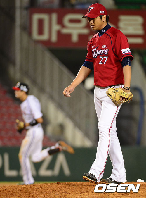 13일 오후 서울 잠실야구장에서 열린 '2013 한국야쿠르트 세븐 프로야구' LG 트윈스와 KIA 타이거즈의 경기, 5회말 2사 1루 KIA 신승현이 송은범에 이어 마운드에 올라 첫 타자 LG 김용의에게 2점 홈런을 허용한 뒤 아쉬워하고 있다.