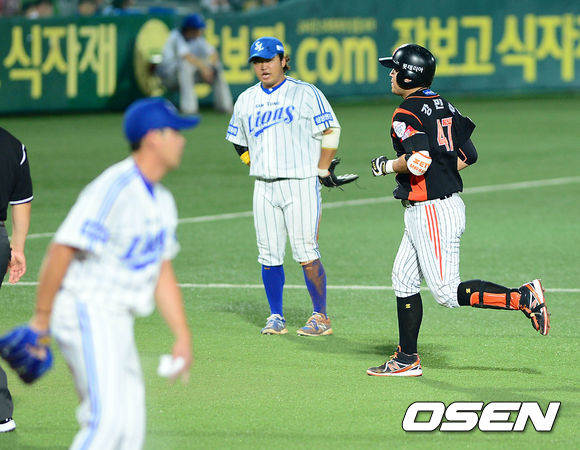 13일 오후 대구시민운동장 야구장에서 열린 2013 한국야쿠르트 세븐프로야구 삼성 라이온즈와 롯데 자이언츠의 경기, 2회초 2사 2루에서 롯데 강민호가 좌월 투런 홈런을 치고 그라운드를 돌고 있다.