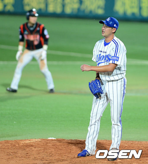 13일 오후 대구시민운동장 야구장에서 열린 2013 한국야쿠르트 세븐프로야구 삼성 라이온즈와 롯데 자이언츠의 경기, 7회초 2사 1루에서 삼성 장원삼이 롯데 정훈에 몸에 맞는 볼을 허용하며 아쉬워하고 있다.