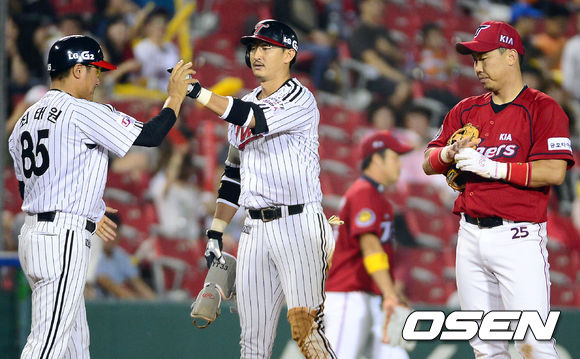 13일 오후 서울 잠실야구장에서 열린 '2013 한국야쿠르트 세븐 프로야구' LG 트윈스와 KIA 타이거즈의 경기, 6회말 무사 LG 박용택이 3루타를 때린 뒤 3루 최태원 코치와 기뻐하고 있다.