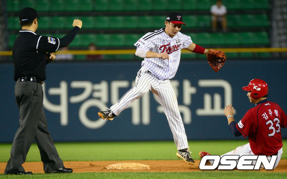 13일 오후 서울 잠실야구장에서 열린 '2013 한국야쿠르트 세븐 프로야구' LG 트윈스와 KIA 타이거즈의 경기, 7회초 무사 1루 LG 손주인이 KIA 차일목의 내야땅볼 타구때 1루 주자 김주형을 포스아웃 시키고 있다.