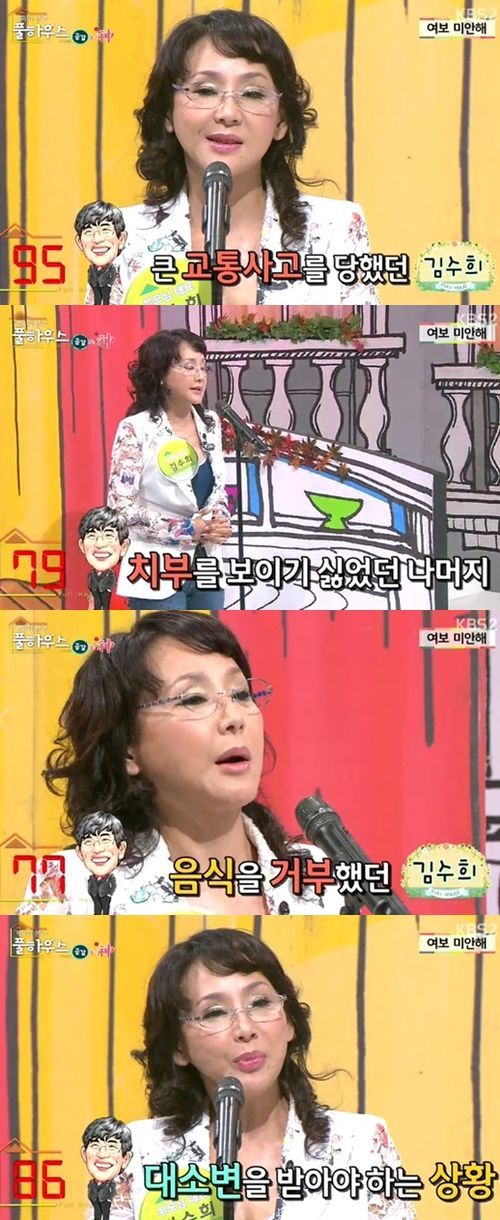 김수희는 "당시 간병을 남편이 했다. 남편이 대소변을 받았는데 나는 치부를 보이기 싫어 음식을 거부했었다. 일주일이 지나 탈수 증상이 왔고 죽을 수도 있다는 말을 들었다"라고 미안한 마음을 전했다.