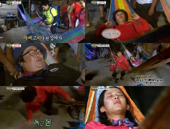 푸짐한 저녁식사를 먹고 해먹 위에 누운 병만족은 편안한 밤을 보냈다. 처음에는 해먹에 눕기까지 약간의 불편을 겪었지만 이내 김병만부터 류담까지 편안한 자세로 해먹 위에 안착했다.