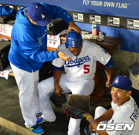 14일 (이하 한국시간) 미국 캘리포니아주 로스앤젤레스 다저스타디움에서 열린 2013 메이저리그 LA 다저스와 샌프란시스코 자이언츠의 경기, 덕아웃에서 다저스 류현진이 유리베에게 헬멧을 거꾸로 씌우고 있다.